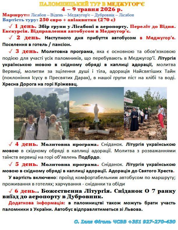 ПАЛОМНИЦЬКИЙ ТУР В МЕДЖУГОР’Є 4 - 9 травня 2026 р.