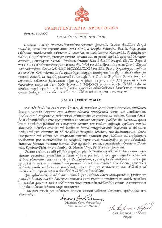 На основі повноважень, отриманих від Папи Франциска, Апостольська Пенітенціарія 20 жовтня 2016 р. видала декрет про оголошення Ювілейного року 400-ліття Василіянського Чину Святого Йосафата, у якому зазначено, що під час цього Ювілею ченці-василіяни та вірні, які разом з ними будуть брати участь у його відзначенні, можуть отримати повний відпуст.