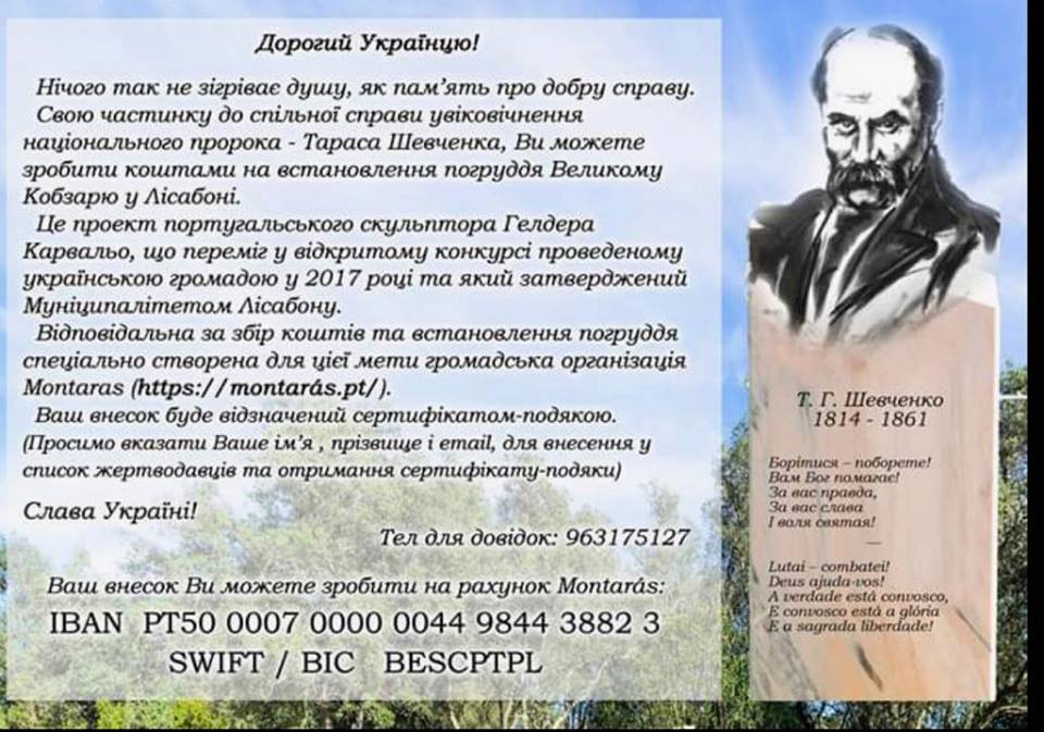 Відкрито рахунок на збір коштів для встановлення погруддя Тараса Шевченка у Лісабоні.
