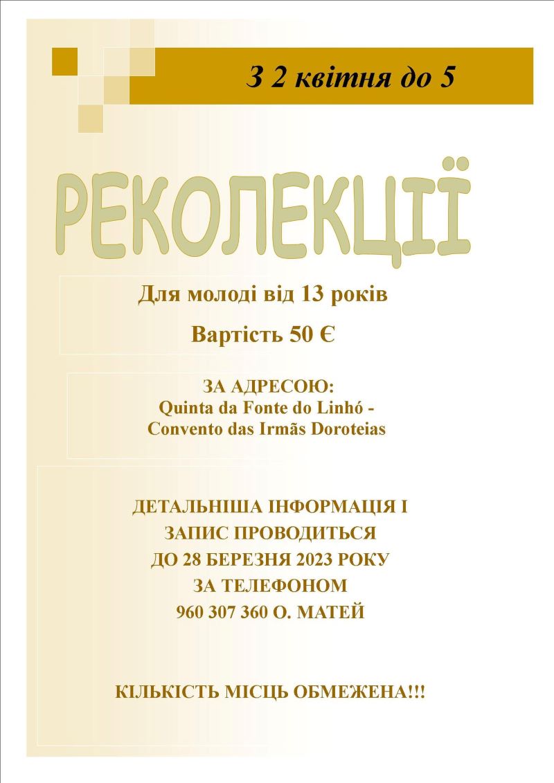 Запрошуємо молодь взяти участь у реколекціях з 2 до 5 квітня, (від Квітної неділі до страсної середи)!!!